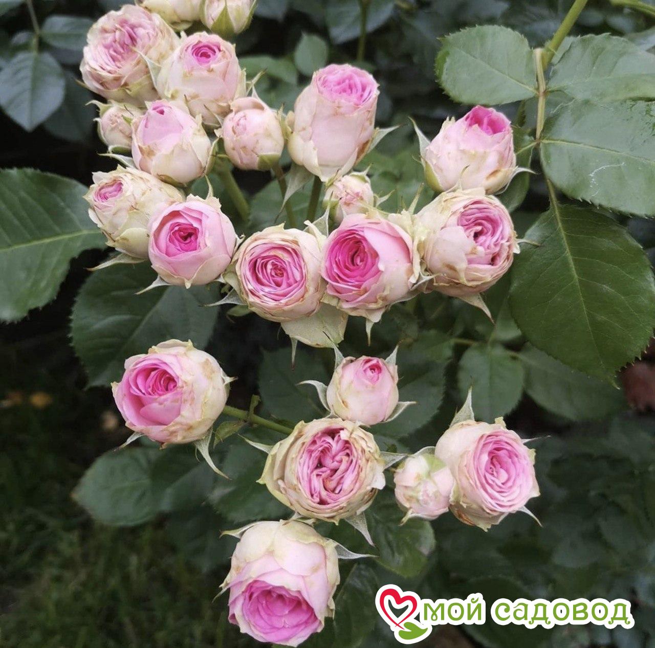 Роза Мими Эден Представленный на фото каталога сорт выведен в 2001 году во Франции. Для этого селекционеры скрестили полиантовую и чайную розы. Растение встречается под производственным наименованием MEIptipier. Ботаническое описание Мими Эден – аккуратный кустик, высота которого достигает не более 85 см (чаще в пределах 50 см). Со временем он довольно хорошо разрастается в диаметре. Стебли плотные, с минимальным количеством шипов. Листва глянцевая, некрупная, ярко-зелёного цвета. Со средины лета и до осенних заморозков саженцы радуют глаз обильным цветением. Обычно на цветоножке образуется 5 – 10 бутонов. Последние раскрываются постепенно, сменяя друг друга. Набитие лепестков достаточно плотное (в каждом цветке от 27 до 40 штук). Соцветия шарообразной формы, двухцветные. Сердцевинка бледно-розовая, густомахровая, с бело-зелёной окантовкой. Диаметр полностью раскрывшегося цветка не превышает 5 см. Роза источает слабый аромат, с лёгкими цветочными нотками. Применение Роза Мими Эден может использоваться для контейнеров и бордюров. Многие цветоводы выращивают многолетник в саду или для срезки. Растение достойно украсит не только частную территорию, но и зону отдыха в парках и скверах. Агротехника Под посадку розы Мими Эден отводят хорошо освещённые места. Поскольку куст широко разрастается, не лишней будет организация опоры. Рассаду можно размещать группками, на расстоянии 50 см друг от друга. Также на развитие многолетника влияет состав почвы. Для полноценного роста цветам нужен питательный, рыхлый и воздухопроницаемый субстрат. По уходу рекомендуется соблюдать несколько простых правил. К примеру, обеспечить рассаде умеренный полив тёплой и отстоянной водой. После процедуры важно разрыхлить землю вокруг кустов, чтобы не образовывалась корка. Розы Мими Эден обильно и длительно цветут после внесения фосфорно-калийных подкормок. Удобрения желательно использовать 2 раза за сезон — в осенний и весенний период. Перед началом морозного сезона саженцы надо утеплить. Особенно это касается молодых, неокрепших экземпляров (в первые годы после посадки). С этой целью кустики окучивают грунтом на значительную высоту. Слишком длинные побеги аккуратно пригибают и фиксируют металлическими скобами. Под стебли подстилают еловый лапник, чтобы растение не соприкасалось с влагой. Далее розу накрывают теплоизоляционным материалом – лутрасилом, спанбондом или агроволокном. Для размножения сорта Мими Эден тонкую и гибкую макушку побега не используют. Её нужно состричь острым секатором. Оставшийся стебель, диаметром приблизительно в 0,5 см, нарезают на черенки. С одного побега можно получить 1 – 2 черенка (в зависимости от длины). Преимущества розы Мими Эден У рассматриваемого сорта розы-спрей много положительных качеств. Например, это: хорошая морозостойкость (выдерживает температуру до -26 ˚С); длительный период цветения. Начинается он со средины июня и заканчивается во второй половине сентября. В течение этого времени роза выпускает 2 – 3 волны с интервалом в 14 дней; оригинальная двухцветная окраска лепестков; лёгкий, ненавязчивый аромат; минимальное количество шипиков на побегах; компактные размеры куста. Купить рассаду сорта Мими Эден можно не только в торговых организациях и магазинах, занимающихся облагораживанием садово-парковых зон. Качеств